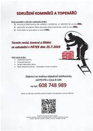 V neděli 16. 11. 2025 bude u nás firma TOPENÁŘSKÝ SERVIS s.r.o. provádět revize, kontroly a čištění komínů. Je nutné se objednat na telefonním čísle 608 748 989. Více informací na přiloženém letáčku. Tuto službu nezajišťuje OÚ.