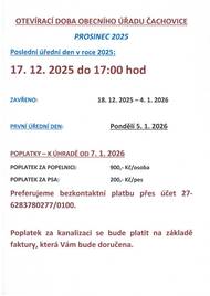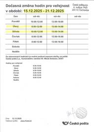 Pošta Čachovice oznamuje otevírací dobu v období 9.12.-31.12.2025 zkrácené doba, 2.1.2026 zavřeno.