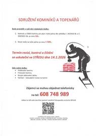 Sdružení kominíků a topenářů bude provádět v naší obci ve STŘEDU dne 14.1. požadované kontroly a čištění komínů na tuhá paliva dle zákonu č. 34/2016 Sb. za následující ceny: - Čištění komínů: 550 Kč - Revize kotlů na tuhá paliva: 1.300 Kč. Zájemci se mohou objednat na telefonním čísle 608 748 989