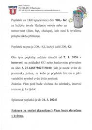 Poplatek za TKO (popelnice) činí 900,- Kč za každou trvale hlášenou osobu nebo za nemovitost (dům, byt, chalupa), kde není k trvalému pobytu nikdo přihlášen. Poplatek za psa je 200,- Kč, každý další 200,-Kč. Splatnost poplatků je do 31. 3. 2026!