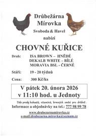 DRŮBEŽÁRNA MÍROVKA, Svoboda-Havel, prodává v pátek 20. února 2026 v 11:10 hod. u Jednoty nosné kuřice (hnědé, černé a bílé) - stáří 19-20 týdnů, cena 300 Kč/ks. Objednání je možné na tel.: 777 98 99 78 nebo drubezarna.mirovka@seznam.cz