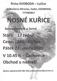 V pátek 27.2.2026 v 10:45 u obchodu v Čachovicích proběhne prodej nosných kuřic v ceně 260,-/kus.