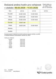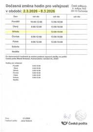 Ve středu 4.3.2026 bude omezená doba pracovní doby pošty Čachovice - otevřeno bude pouze 13:00-18:00.