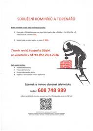V naší obci bude dne 20.3.2026 sdružení kominíků a topenářů provádět čištění komínů (550,-)a revize kotlů (1.300,-). Nutné se objednat na tel. čísle 608 748 989.