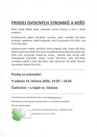 V sobotu 14. 3. 2026 od 14:25 do 14:35 proběhne u kapličky v Čachovicích prodej ovocných stromků a keřů z vlastní produkce Školního statku Mělník.