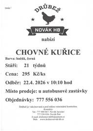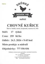 Drůbež Novák HB – drůbežárna Mírovka bude prodávat dne 24. 3. 2026 nosné kuřice před snůškou, stáří 17 týdnů, za cenu 255 Kč za kus, barva hnědá a černá. Prodej proběhne v 9:45 v Čachovicích u nádraží a v 10:10 ve Struhách na návsi.
