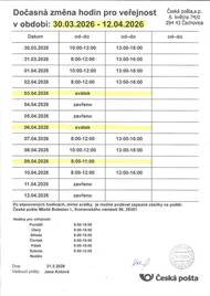 Pošta Čachovice oznamuje omezení pracovní doby ve čtvrtek 9.4.2026, otevřeno bude pouze 8:00-11:00.