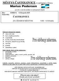 Obecní restaurace Na Pohodu ve spolupráci s Městysem Častolovice Vás zve dne 7. prosince 2025 od 14: 00 hodin na Vánoční Jarmark v okolí kostela Sv. Víta v Častolovicích. Program: Vystoupení dětí, dílničky pro děti. Doprovodný program: Muzeum veteránů u Hlásků, Muzeum Častolovicka, od 16: 00 "Přes Peklo k Mikuláši", koncert v kostele Sv. Víta více informcí na webových stránkách Městyse Častolovice. Muzeum Častolovicka Vás zve na Vánoční výstavu v neděli 7. 12. 2025 od 13: 00 - 18: 00 hodin. Městys Častolovice Vás zve na veřejné zasedání č. 19 Zastupitelstva městyse Častolovice konané dne 10. 12. 2025 v Kulturním domě u Lva od 17: hodin. Program: 1. Zahájení 2. Program jednání ZM-19-2025 3. Zpráva z kontrolního výboru 4. Rada městyse Častolovice 5. Rozpočet na rok 2026 6. Smlouvy KHK 7. Smlouva o smlouvě budoucí kupní - Náměstí 8. Kupní smlouvy - pozemky 9. Vnitřní směrnici č. 5 o zadávání veřejných zakázek malého rozsahu 10. Změna územního plánu Častolovice 11. Smlouvy pozemky cyklostezka 12. Rozpočtové opatření č. 9 13. Příspěvek na obědy seniorům 14. Žádost o finanční příspěvek 15. Finanční výbor 16. Různé + Diskuze