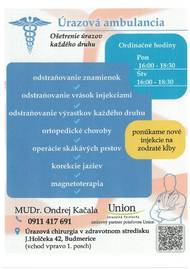 Ambulanciu úrazovej chirurgie nájdete v zdravotnom stredisku v Budmericiach, vchod vpravo, na 1. poschodí. MUDr. Ondrej Kačala telefónny kontakt: 0911 417 691