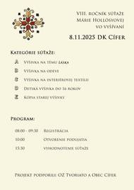 Pozývame Vás na VIII. ročník súťaže Márie Hollesovej vo vyšívaní, ktorý sa bude konať dňa 8.11.2025 v Dome kultúry Cífer.
