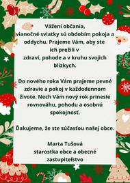 Obecný úrad oznamuje, že od 19. decembra 2025 do 5. januára 2026 bude zatvorený z dôvodu čerpania dovolenky. Úradné hodiny budú obnovené od 7. januára 2026.