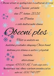 Dne 17.01.2026 od 19:00 hodin zveme všechny občany na obecní ples. Těšit se můžete na přípitek, květinu pro dámu, hudební produkci skupiny Oáza band, občerstvení a hlavně na příjemnou atmosféru společenské akce. Registrace od pondělí 15.12.2025 na obec-cavisov.reenio.cz/cs nebo tel 606741097