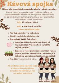 Zveme všechny sousedy na první setkání u kávičky. V sobotu 25.04.2026 od 15:00 vás přivítáme s kávou, dobrůtkou a pro děti máme mléčnou pěnu. Můžete jen posedět, poklábosit, ale také vyměnit sazeničky nebo něco malého, co už doma neupotřebíte. Zvou vás Sylva, Lucka a Katka