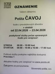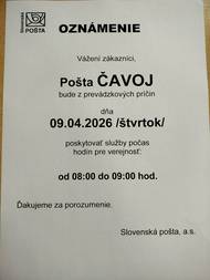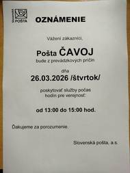 Oznámenie o montáži vodomerov do domácností napojených na obecný vodovod V zmysle uznesenia Obecného zastupiteľstva obce Čavoj č. 23/2025 zo dňa 10.04.2025 Vám oznamujeme, že obec Čavoj bude montovať vodomery do domácností napojených na obecný vodovod v čase od 07.10.2025 do 17.10.2025. Preto Vás žiadame, aby ste sprístupnili vodomernú šachtu pracovníkom montážnej firmy. Poplatok za prenájom vodomeru bol stanovený vo výške 60,00 € na obdobie 6 rokov. Poplatok je splatný v lehote 10 dní odo dňa inštalácie vodomeru na číslo účet obce Čavoj: SK09 0900 0052 3398 6272 zriadený k prevádzke vodovodu, prípadne do pokladne obce na obecnom úrade Čavoj, Čavoj 86, 972 29 Čavoj. V prípade otázok kontaktujte pracovníkov obecného úradu na telefónnom čísle – 046/5458002, prípadne starostku obce na telefónnom čísle – 0911574874