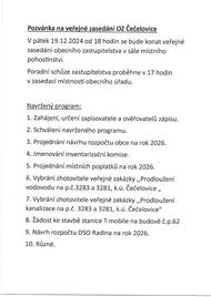 V pátek 19.12.2025 od 18 hodin se bude konat veřejné zasedání obecního zastupitelstva v sále místního pohostinství.