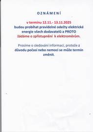 Oznamujeme že, 12.11. - 13.11. budou probíhat odečty elektrické energie-žádáme o zpřístupnění elektroměrů. děkujeme za spolupráci.