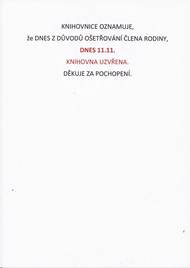 Knihovnice oznamuje čtenářům, že dnes je bude KNIHOVNA uzavřena, z důvodů ošetřování člena rodiny. Děkuje za pochopení.