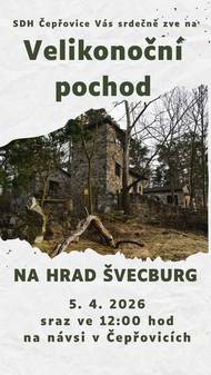Vážení občané, tradice je tradice a tak i v roce 2026 můžete společně s SDH Čepřovice vyrazit na ,,Velikonoční pochod na hrad Švecburg”. Sraz je jako vždy ve 12:00 hod na návsi v Čepřovicích v neděli 5. 4. 2026. Na všechny se těšíme