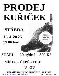 Vážení občané, ve středu 18. 3. 2026 v 15:00 hod na návsi v Čepřovicích. Stáří prodávaných kuřiček 20 týdnů - cena 270 Kč. Kontakt na prodejce 602 151 750.