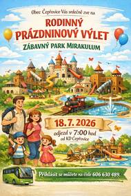 Vážení občané, obec pro Vás a Vaše děti připravila pravidelný RODINNÝ PRÁZDNINOVÝ VÝLET - pojedeme opět do rodinného parku Mirakulum. Termín je 18.7.2026 odjezd v 7:00 hodin od KD Čepřovice. Cena bude upřesněna podle toho, zda se povede obci opět úspěšně získat grant. Přihlásit se můžete na čísle 606 630 489.