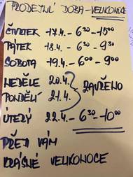 Z důvodu čerpání dovolené bude v následujících 2 týdnech omezená provozní doba v místní prodejně, a to následovně: v pátek 17. 10. bude otevřeno v čase 6:30-10:00 hodinv sobotu 18. 10. bude zavřenov pátek 24. 10. bude otevřeno v čase 6:30-10:00 hodinv sobotu 25. 10. bude zavřeno.Ostatní dny zůstává prodejní doba beze změny. Děkujeme za pochopení.