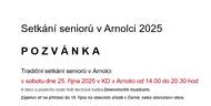 P O Z V Á N K A Tradiční setkání seniorů v Arnolciv sobotu dne 25. října 2025 v KD v Arnolci od 14.00 do 20.30 hodK tanci a poslechu bude hrát dechová hudba Zelenohorští muzikanti.Zájemci ať se přihlásí do 19. října na obecním úřadě v Černé, nebo starostovi obce. Pozvanka-obcim-setkani-senioru-v-Arnolci-sobota-25.rijna-2025.pdf