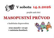 Před 1 měsícemMasopustní průvod 14.2., půjčování kostýmů 7.2.2026V sobotu 14. února 2026 projde naší obcí tradiční masopustní průvod. Sraz účastníků průvodu je v 10:30 v místním hostinci. Zájemci o účast v masopustním průvodu si mohou přijít půjčit masku v sobotu 7. února mezi 15. - 16. hodinou na Obecník. Vítány jsou i vlastní kostýmy. Těšíme se na hojnou účast!