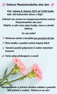 MDŽ Milé dámy, srdečně Vás zveme na oslavu Mezinárodního dne žen 8.3.2025 na sále v Rájci od 19 hodin! Přijďte s námi strávit příjemný večer v doprovodu kapely RAJC, dobré nálady a překvapení. Pro prvních 40 žen máme připravený krásný karafiát a osvěžující drink na přivítanou. Své horší polovičky můžete vzít sebou. Vstupné je zdarma, ale pokud budete chtít přispět na hudební produkci, máte volnou ruku. Těšíme se na Vás!