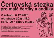 Pekelně dobrá zábava pro všechny děti! Čeká vás několik stanovišť, kde si malí čertíci vyzkouší skok přes čertův ocas, pekelný hod bramborou nebo hledání ztracených uhlíků. A možná potkáte i nějakého toho čerta. POZOR – JE NUTNÉ DĚTI PŘEDEM PŘIHLÁSIT!