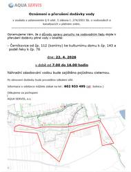 Z důvodu opravy poruchy na vodovodním řadu dojde k přerušení dodávky pitné vody ve středu 22.04.2026 v době od 7.00 do 16.00 v lokalitě: Černíkovice od čp. 112 (konírny) ke kulturnímu domu k čp. 143 a podél řeky k čp. 76.