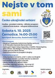 Česko-ukrajinské setkání nabídne hudbu, občerstvení, dětský program, dobročinnou aukci. Vystoupí: Katya Gapochka, 4 KAFKY, Maria Kaplina, Dick O‘Brass, Ota Balage a Franta Kop (J.A.R.), Český samuraj J. Zeman. Moderují: Svyatoslav Kalishchuk (Spilka centrum) & Jiří Maryško (Havloids Memorial Club).