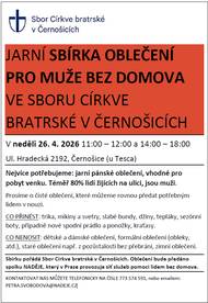 Oblečení lze nosit od 11 do 12, od 14 do 18. Nejvíce je třeba jarní pánské oblečení, vhodné pro pobyt venku. Prosíme o čisté oblečení, které lze rovnou předat potřebným. Sbírku pořádá Sbor Církve bratrské. Oblečení putuje spolku NADĚJE, který v Praze provozuje síť služeb pomoci lidem bez domova.
