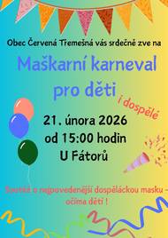 Srdečně vás zveme na maškarní karneval pro děti i dospělé a to 1. března 2025 od 15 hodin u Fátorů v Červené Třemešné.
