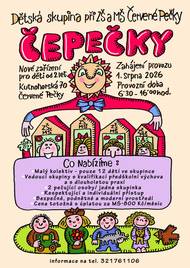 Dětská skupina ČEPEČKY při ZŠ a MŠ Červené Pečky zahajuje svůj provoz v nových prostorách 1. srpna 2026. Zájemci o umístění svých dětí od dvou let věku se mohou informovat na telefonu 321 761 106 v ředitelně základní školy.
