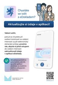 Ve dnech 3. a 4. října 2025 se uskuteční volby do Poslanecké sněmovny Parlamentu České republiky. Zveme všechny voliče, aby využili svého volebního práva a přišli k volbám. V těchto volbách je nově možné prokázat totožnost také pomocí aplikace eDoklady. Pokud se rozhodnete tuto možnost využít, je nutné mít v aplikaci zaktualizované údaje nejpozději 48 hodin před vstupem do volební místnosti. Aktualizace probíhá automaticky po spuštění aplikace eDoklady na mobilním zařízení připojeném k internetu nebo mobilním datům. Upozorňujeme, že ve volebních místnostech nebude k dispozici Wi-Fi připojení, proto je důležité provést aktualizaci s dostatečným předstihem. Více informací naleznete na webu: edoklady.gov.cz.