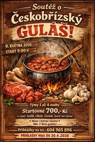 Vyhlášena soutěž o Českobřízský guláš. Sobota 9.5.2026 , start 9:00 hod. Přihlášky do 30.4.2026, tel: 604 965 896