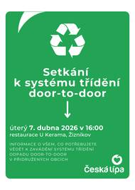 Před 20 dnySetkání k systému door-to-door v přidružených obcíchVážení občané, od 1. června bude v místě vašeho bydliště zavedný svoz odpadu v rámci systému třídění door-to-door. Co to pro vás znamená? Jak si objednat nové nádoby na odpad přímo k domu? Kdy se bude vyvážet? Odpovědi na všechny tyto dotazy dostanete na veřejném setkání, které proběhne v úterý 7. dubna od 16:00 v restauraci U Kerama v Žizníkově. Těšíme se na vás! město Česká Lípa