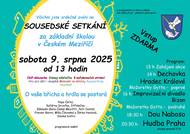 Přijďte si v sobotu 9.8.2025 popovídat se svými sousedy, přáteli a kamarády na tradiční Sousedské setkání za Základní školou! 🕐 Začínáme ve 13:00 — těšit se můžete na bohatý program pro děti i dospělé: 🎈 Skákací hrady, nafukovací atrakce, malování na obličej, bazény 🎺 14:00 – vystoupení dvacetičlenné dechové kapely 💃 Mažoretky Gytta – jejich premiérové vystoupení 🎭 Improvizační divadlo B.I.Z.O.N. 💃 Mažoretky Gytta – druhé vystoupení 🎤 Trio krásných žen Dou Naboso 🎸 Závěr večera: koncert legendární kapely Hudba Praha 🍽️ Výborné občerstvení a dobroty pro vás připraví místní kulinářští specialisté – těšte se na vůni grilu, sladké i slané dobroty a osvěžující nápoje.