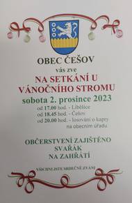 Dobrý den, Obec Češov vás zve na setkání u Vánočních stromů dne 30.11.2024 v Liběšicích od 17:00 hod a v Češově od 18:45 hod. Občerstvení zajištěno, svařák na zahřátí.