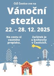 Český svaz žen Čestice Vás zve na Vánoční stezku. Od 22.12. do 28.12. - start v Česticích u knihovny. Na cestu si vezměte propisku.