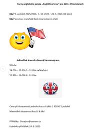 Kurzy anglického jazyka "Angličtina hrou" pro děti v Chlumčanech začínají od 1.10.2025 a budou probíhat ve středu odpoledne v prostorách mateřské školy. Přihlášky do 24.9.2025. Bližší informace na letáku.