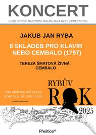 Dům historie Přešticka uvádí v sobotu 11.10.2025 od 16:00 koncert 8 skladeb pro cembalo - J. J. Ryba. Klavíristka a cembalistka Tereza Šmatová Živná nastudovala 8 skladeb pro cembalo nebo klavír Jakuba Jana Ryby. V rámci letošního "Rybova roku" skladby přednese v Domu historie Přešticka na cembalo.