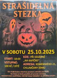 V sobotu 25.10.2025 od 18:00 se koná Strašidelná stezka při kavárně "Na kafíčko". Vstupné 100,- Kč. Občerstvení zajištěno.