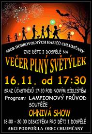 SDH Chlumčany zve děti i dospělé na večer plný světýlek v neděli 16.11.2025 od 17:30 hodin. Program: lampionový průvod, soutěže, ohnivá show. Od 18:00 do 20:00 diskotéka pro děti i dospělé.