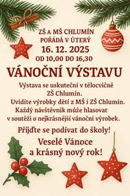 VÁNOČNÍ VÝSTAVA ZŠ A MŠ CHLUMÍN 16.12.2025 OD 10:00 HOD. DO 16:30 HOD. OZNÁMENÍ O UZAVŘENÍ OÚ CHLUMÍN OD 22.12.2025 - 04.01.2026 Z DŮVODU DOVOLENÉ VÁNOČNÍ TURNAJ VE STOLNÍM TENISE O POHÁR STAROSTY OBCE 20.12.2025 OD 08:00 HOD.