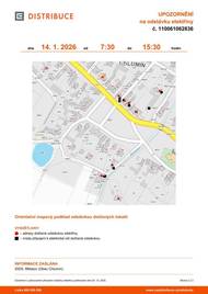 Oznamujeme plánovanou odstávku elektřiny, která se uskuteční dne 14. ledna 2026 od 7:30 do 15:30 hodin. Tato odstávka se týká lokality Chlumín, konkrétně čísel popisných 6, 7, 44, 47, 48, 49, 50, 76, 105 a 183.