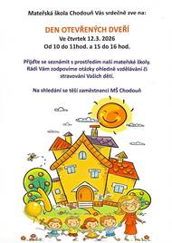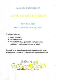 Zápis dětí do MŠ Chodouň proběhne ve čtvrtek 12.3.2026 od 10 do 11 hodin a od 15 do 16 hodi