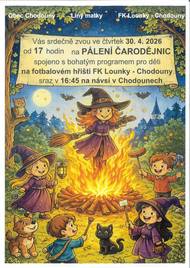 Zveme Vás na "Pálení čarodějnic" dne 30.4.2026 na fotbalovém hřišti FK Lounky Chodouny od 17 hodin s programem pro děti. Buřtíky na opékání a limo pro děti zdarma. Sraz čarodějů a čarodějnic v 16 : 45 hodin na návsi v Chodounech. Všichni jste srdečně zváni.
