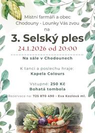 3.Selský ples 24.1.2026 od 20 hodin na sále v Chodounech čp.25. K tanci a poslechu hraje kapela COLOURS. Vstupné 250 Kč.
