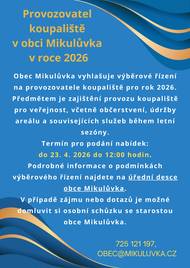 Výběrové řízení obce Mikulůvka na zakázku „Provozovatel koupaliště, Obec Mikulůvka pro rok 2026“.